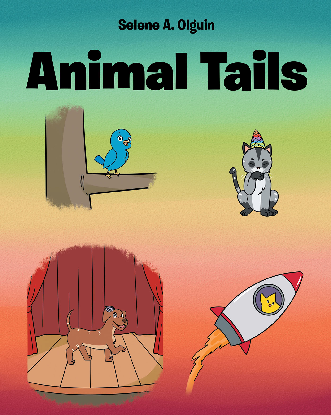 Animal Tails contains four short stories: "The Bird," "The Caticorn," "Daisy the Dog," and "Sammy the Little Star." "The Bird" is about a bird that thinks that he is ugly, but once he actually gets what he thinks he wanted, he realized that he was perfect the way he was."The Caticorn" is about a cat that wanted to be popular, so he disguises himself in order to belong and be accepted by others. However, he realizes that he is fine the way he is."Daisy the Dog is about a dog that gets to be a movie star, and once trouble arises, she realizes that everybody needs help from friends from time to time.The last story is called "Sammy the Little Star." This story is about a star that fell into the ocean and was raised as a starfish. This little star wishes to be a star up in the sky. No matter what he tried, he could not reach the sky. His friends and family helped him to finally reach his dream.